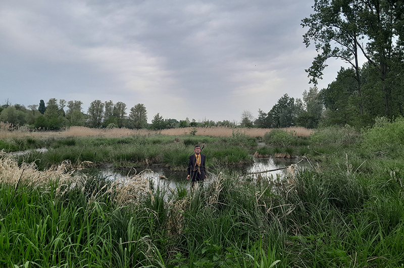 Restait à inventer une forme de spectacle susceptible de se jouer dans ce type de lieu et qui puisse, de manière ludique et humoristique, apporter des éléments d’information à l’intention du grand public, tout en se décalant de la réalité. Ce sera donc un spectacle de science-fiction, en forme de randonnée : nous sommes en 2043, la situation climatique est tragique, il ne reste plus qu’une seule zone humide au monde, celle où se retrouve le public au début du spectacle.