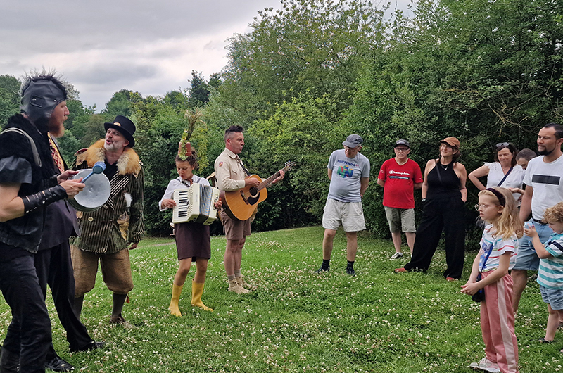 Dès lors, voilà les spectateurs considérés comme des volontaires engagés pour une quête initiatique à travers la zone humide… Une drôle de balade agrémentée de quelques rencontres savoureuses avec des représentants de l’espèce humaine, des réfugiés climatiques relativement décalés (un scout bonhomme et sympathique, un survivaliste un peu rustre sorti tout droit du film Mad Max, un ancien promoteur immobilier en burn out et un scientifique extravagant qui a pris sa retraite dans la zone humide). Ces derniers vont peu à peu dérouler les principaux enjeux de la préservation des zones humides : les espèces à protéger, le fonctionnement d’une zone humide, la question des espèces invasives, la destruction de ces espaces naturels par les activités humaines… Le tout en musique et en humour, avant un final qui ouvre sur quelques pistes d’action à destination du public.